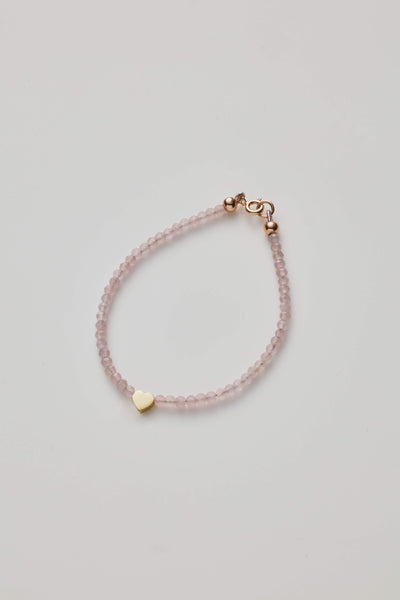 9K gold necklace with rose quartz crystal and a gold letter charm.