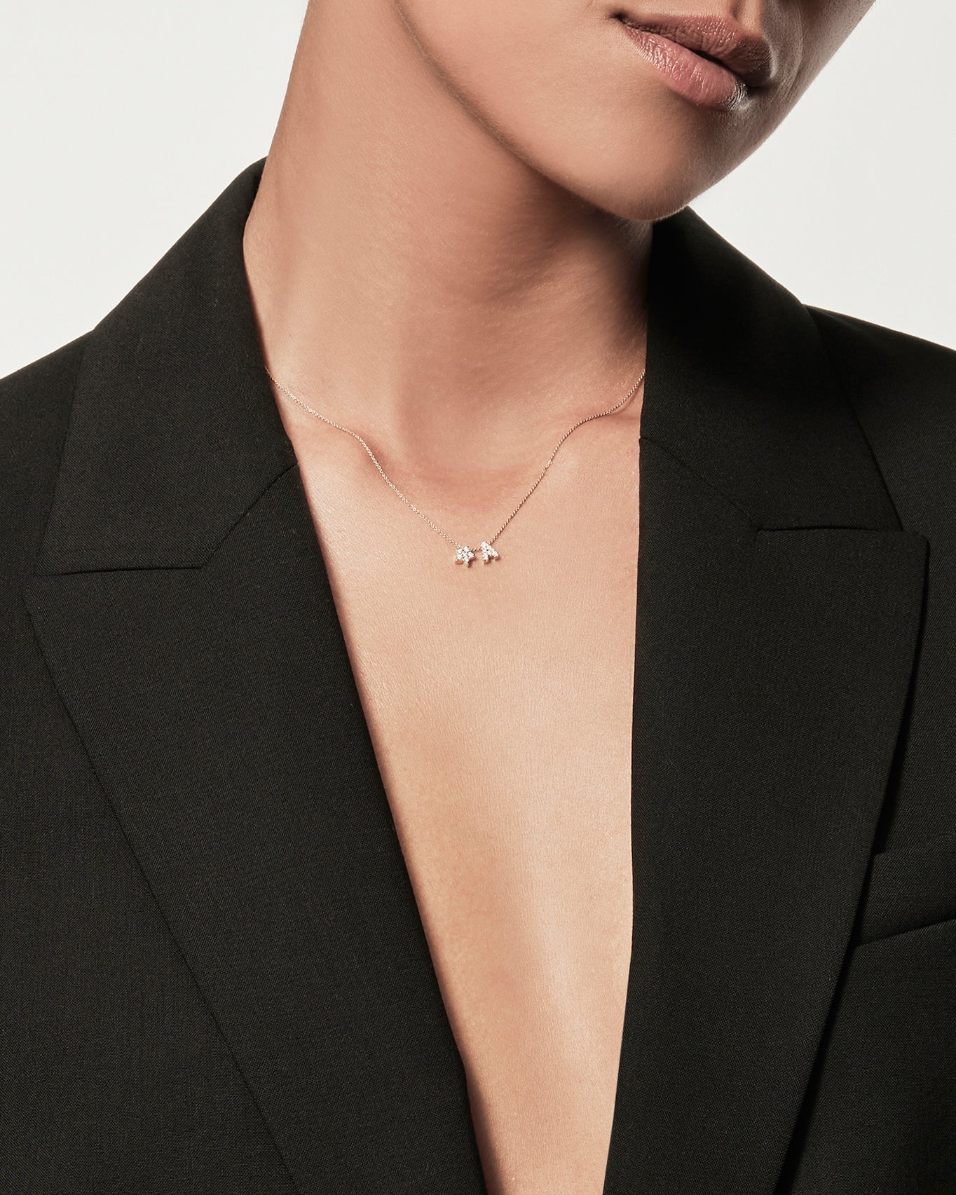 Close-up of a woman wearing a minimalist 18k gold initialS “G” "F" diamond star charm necklace , styled with a black blazer – personalised alphabet pendant jewellery