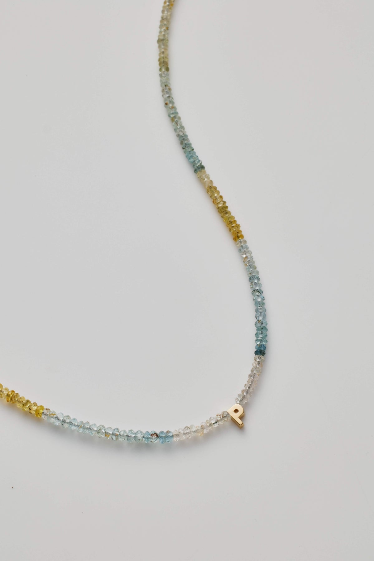 Hand-strung aquamarine necklace is accented with a solid gold letter charm. Aquamarine soothes the mind, encourages self-expression, and restores a sense of calm.