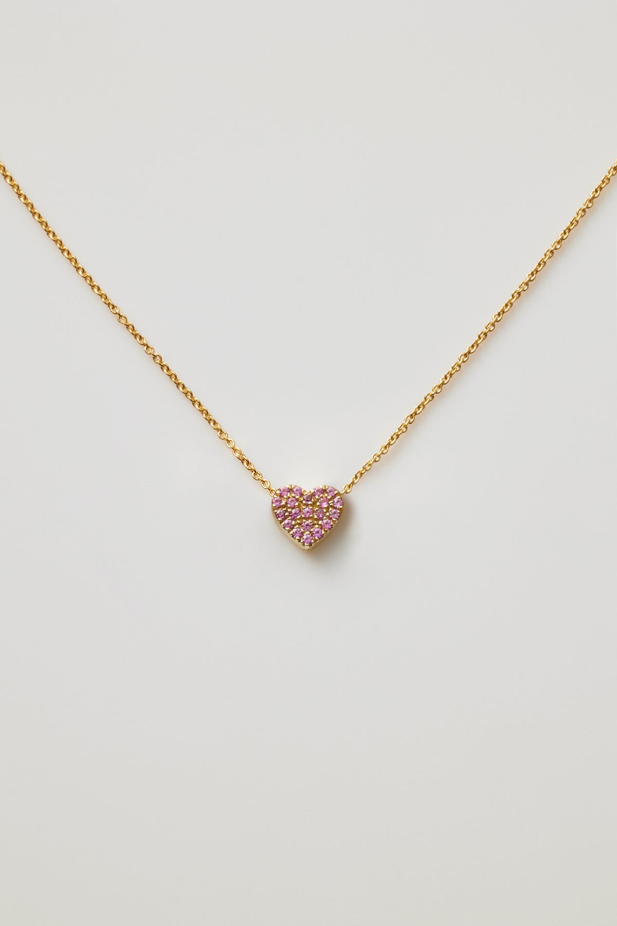 Introduce a sophisticated blush of color with the Pavé Pink Sapphire Heart Necklace. The charm is meticulously set with genuine Pink Sapphires, reflecting warmth and romance.