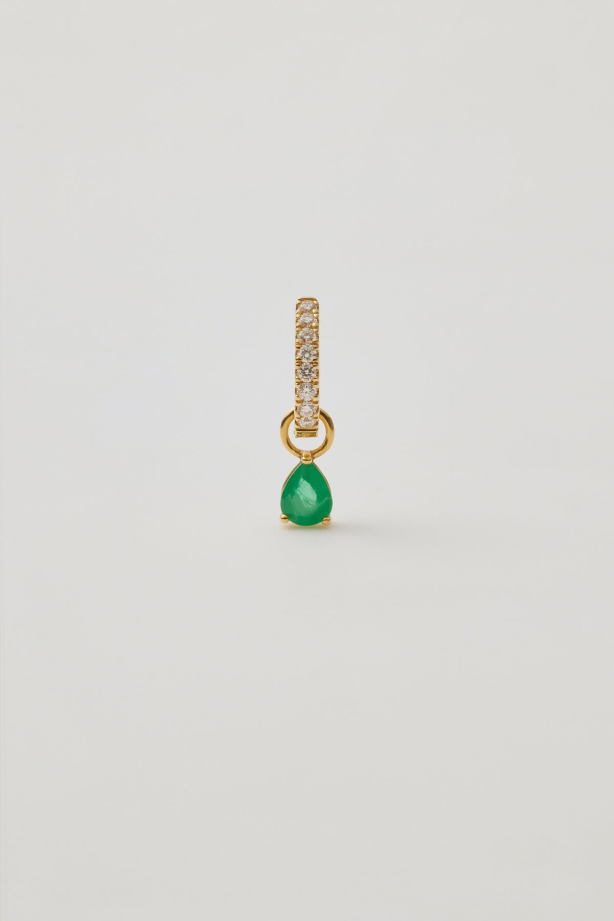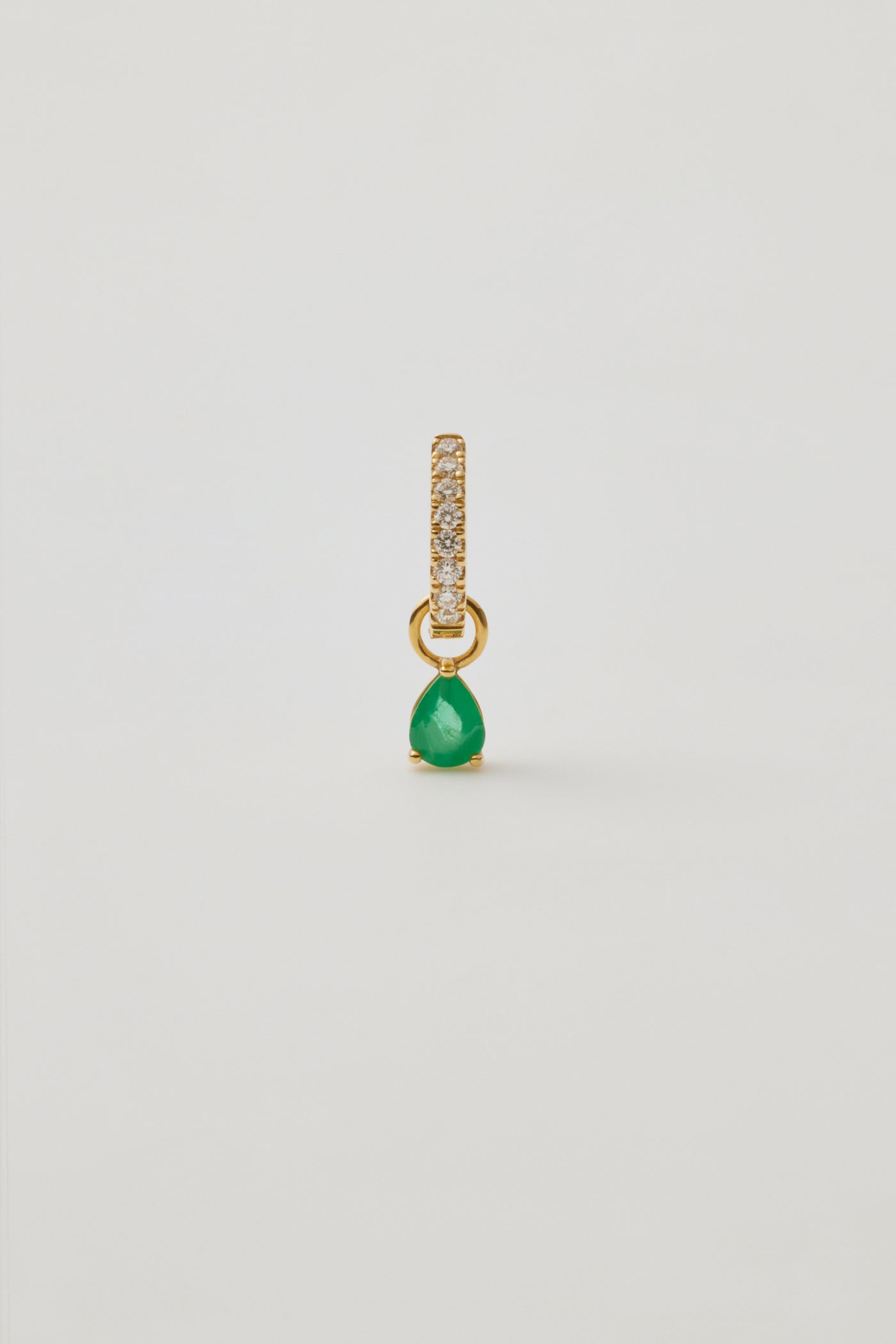 Crafted in 14k solid gold, this single pavé white sapphire huggie earring is designed for versatility. It features an interchangeable tourmaline pear charm. The innovative hinged mechanism lets you simply slide the charm off and switch it with another, allowing you to personalise, rearrange, and build a piece that’s uniquely yours.